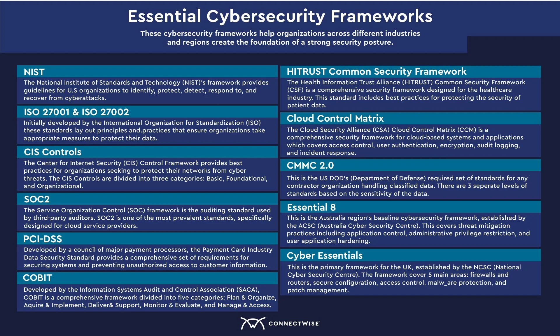 To help you decide which cybersecurity framework is the best fit, we have created the MSP+ Cybersecurity Framework & Playbooks for every stage of the cybersecurity journey. Use this guide to help define what good cybersecurity looks like, or visit the ConnectWise Cybersecurity Center for more information on keeping your customers and business safe.