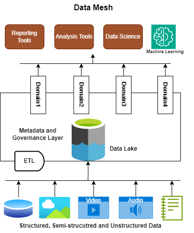 Data mesh promotes decentralized data ownership and management across domains. It encourages cross-functional teams to treat data as a product and take responsibility for its quality and governance, creating a data fabric that facilitates data discovery, access, and sharing.