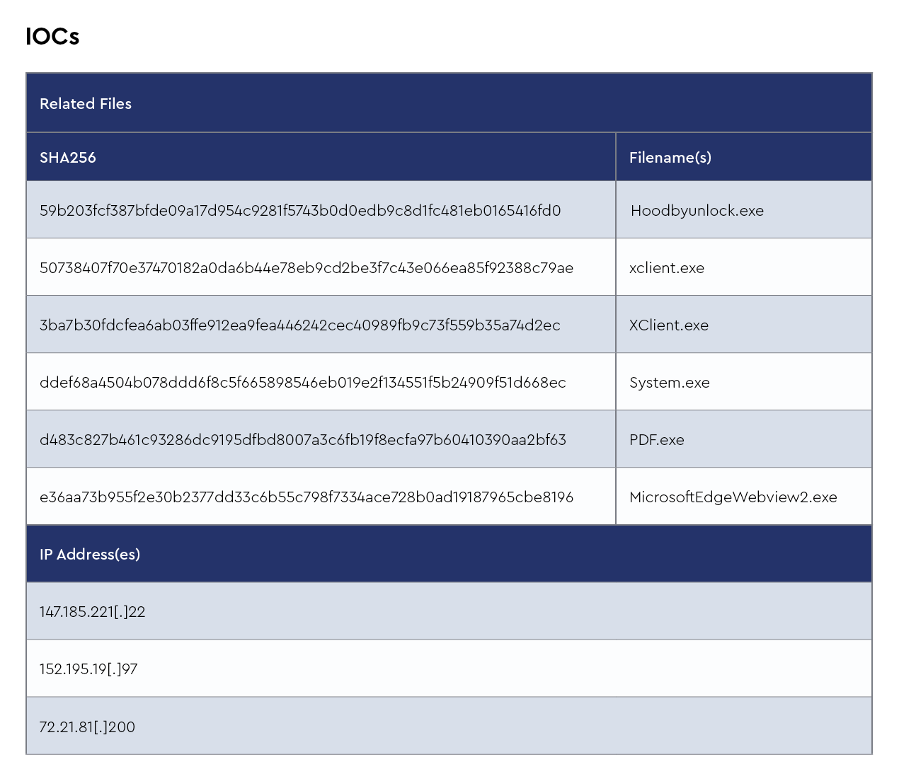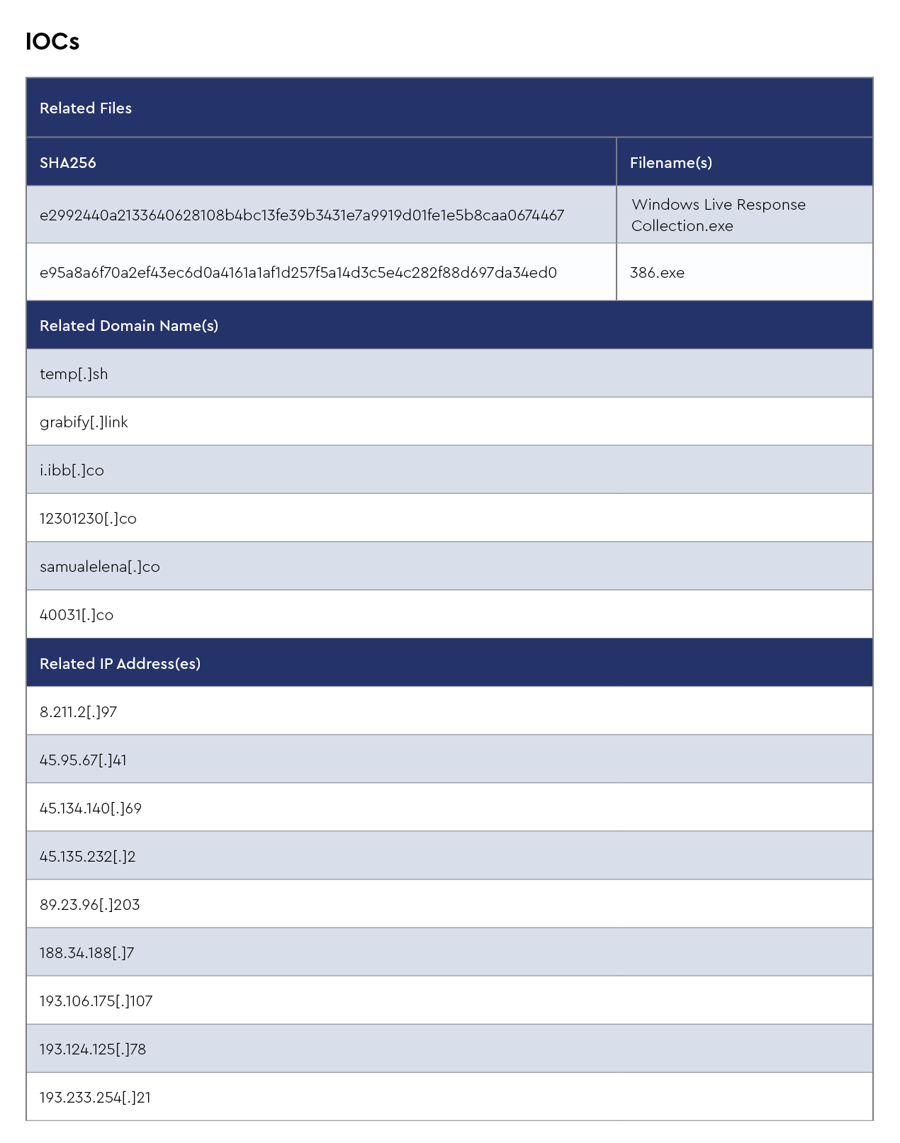 The CRU collects indicators of compromise (IOCs) from public open-source intelligence (OSINT) sources and any cybersecurity incident escalated by the ConnectWise security operations center (SOC). These IOCs are used for automated threat hunting and data enrichment to assist SOC analysts. Below is a summary of the IOCs collected.