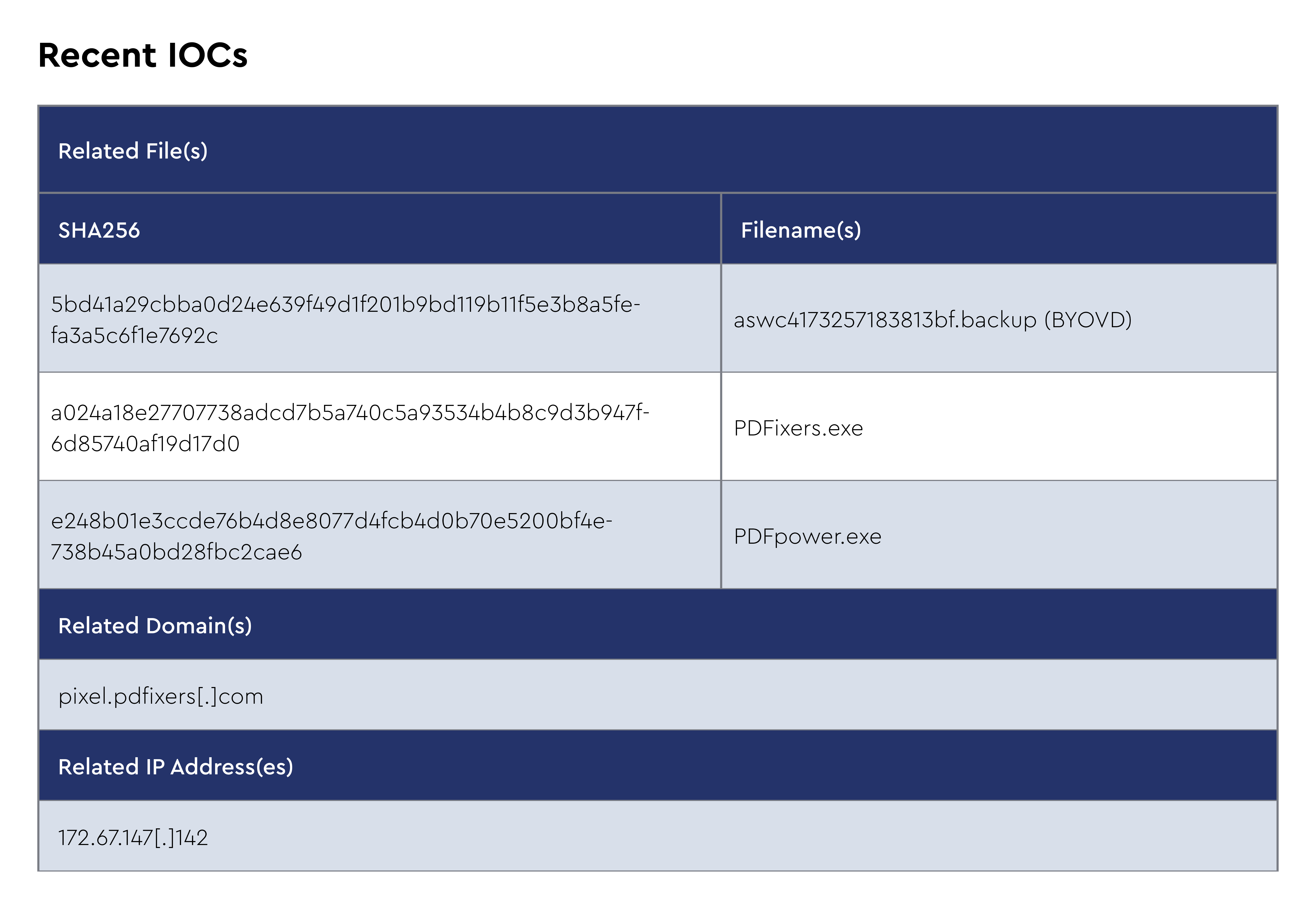 In May 2025, the CRU observed Akira operators using fake PDF converter applications distributed via malvertising, SEO poisoning, and social engineering techniques for initial access. These malicious converters serve as droppers for the Akira payload while appearing legitimate to users searching for PDF conversion tools through compromised search results and malicious advertisements. Additionally, threat actors have adopted “bring your own vulnerable driver” (BYOVD) tactics for EDR evasion, specifically exploiting a vulnerable version of AVG Anti-Rootkit to disable endpoint security solutions before deploying the ransomware.