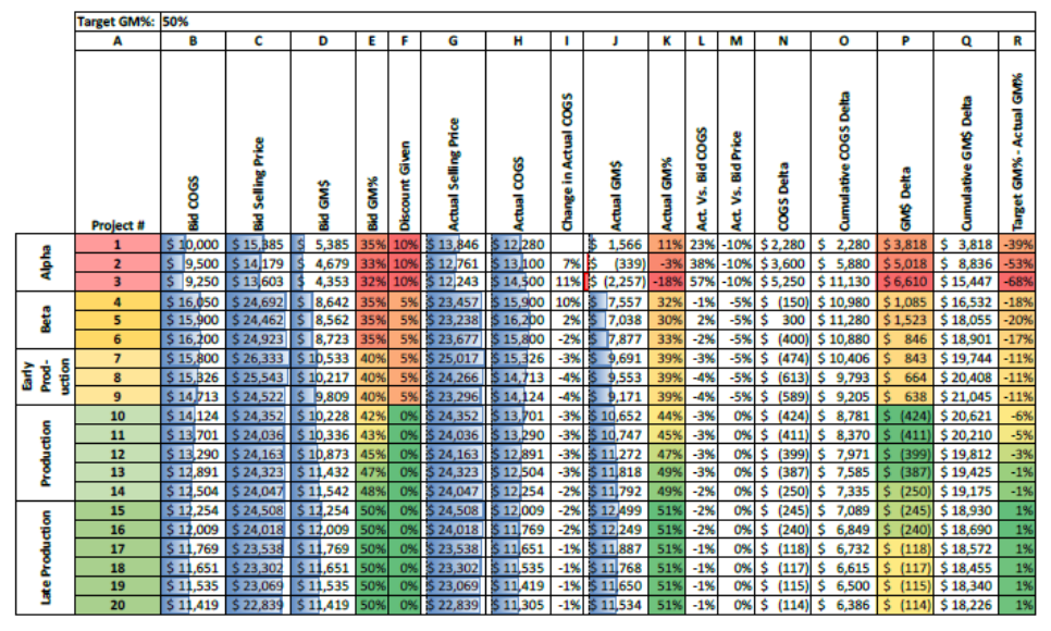 As a result, Project #4 comes in at 32% Actual GM% (column K) and nearly $10,000 gross margin dollars higher than Project #3 (column J).