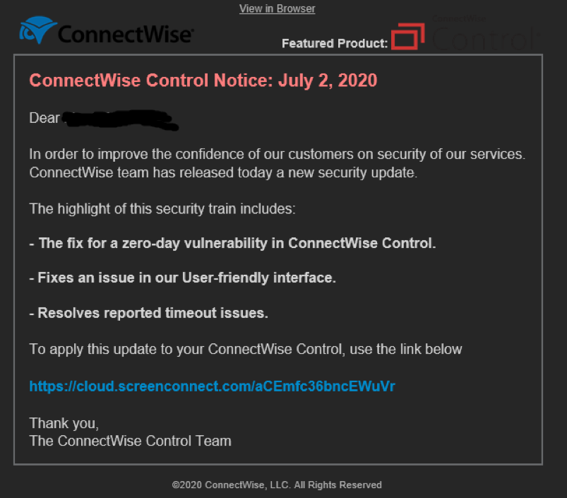 Phishing emails purporting to be ConnectWise Control have been sent to some partners in an attempt to spoof the Control login page and harvest user credentials.