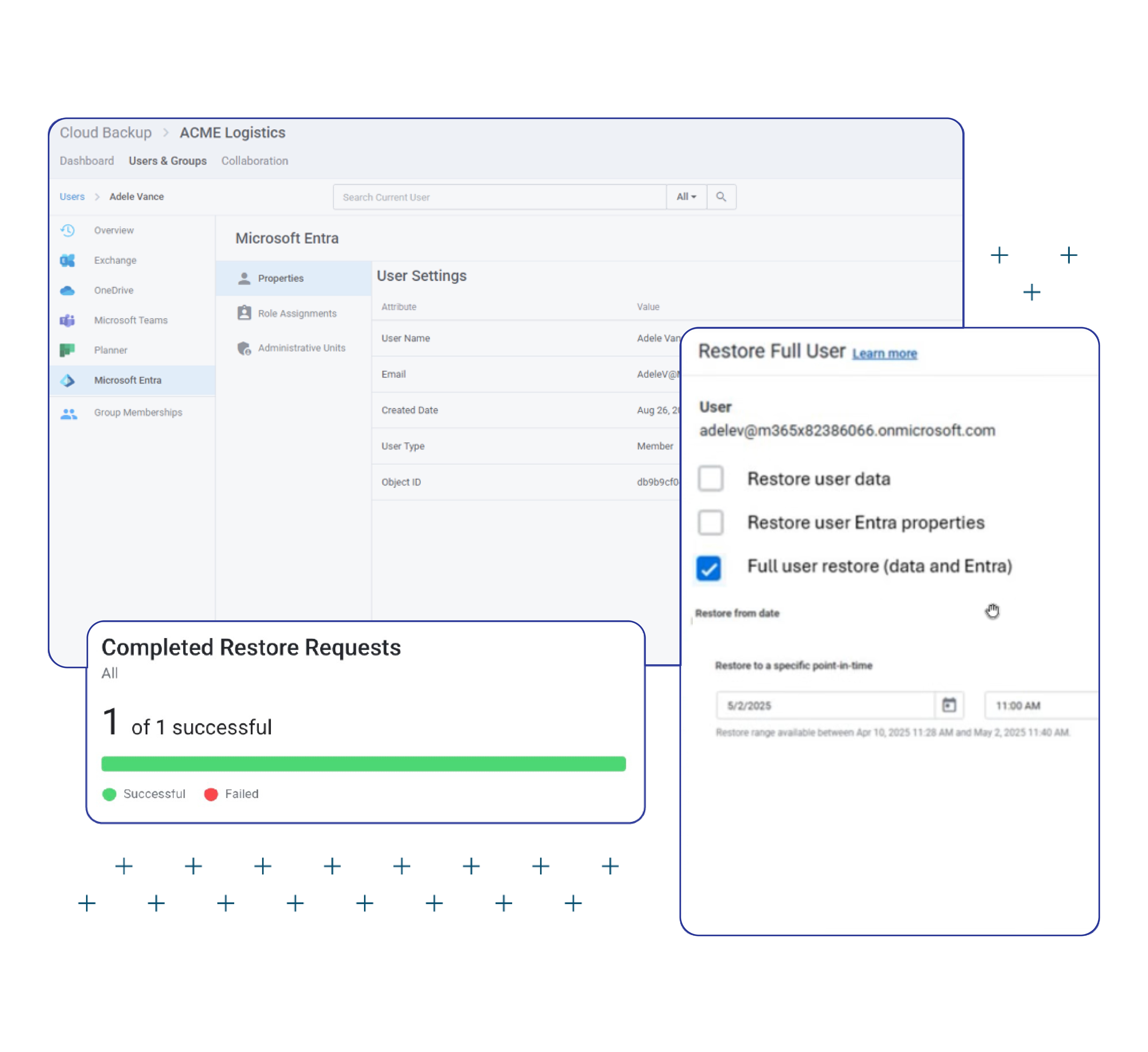 Get comprehensive protection, automated backups, and fast recovery across Microsoft 365 environments, including Entra ID.